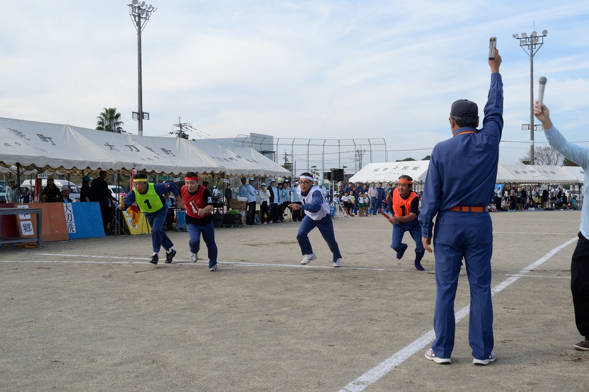 毎年秋に開かれる町民体育大会では、消防分団対抗リレーに出場し、各分団優勝目指して力走します。