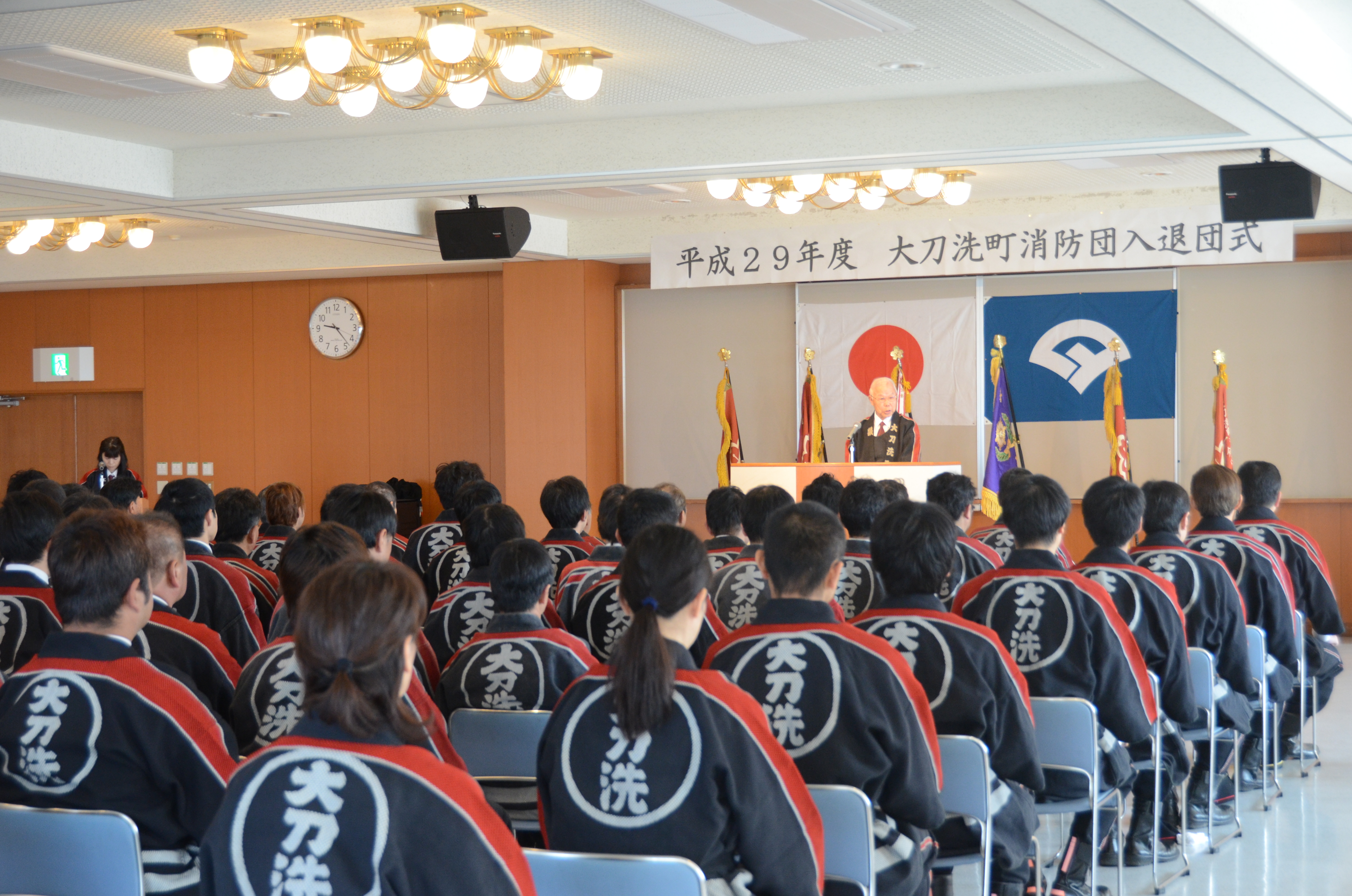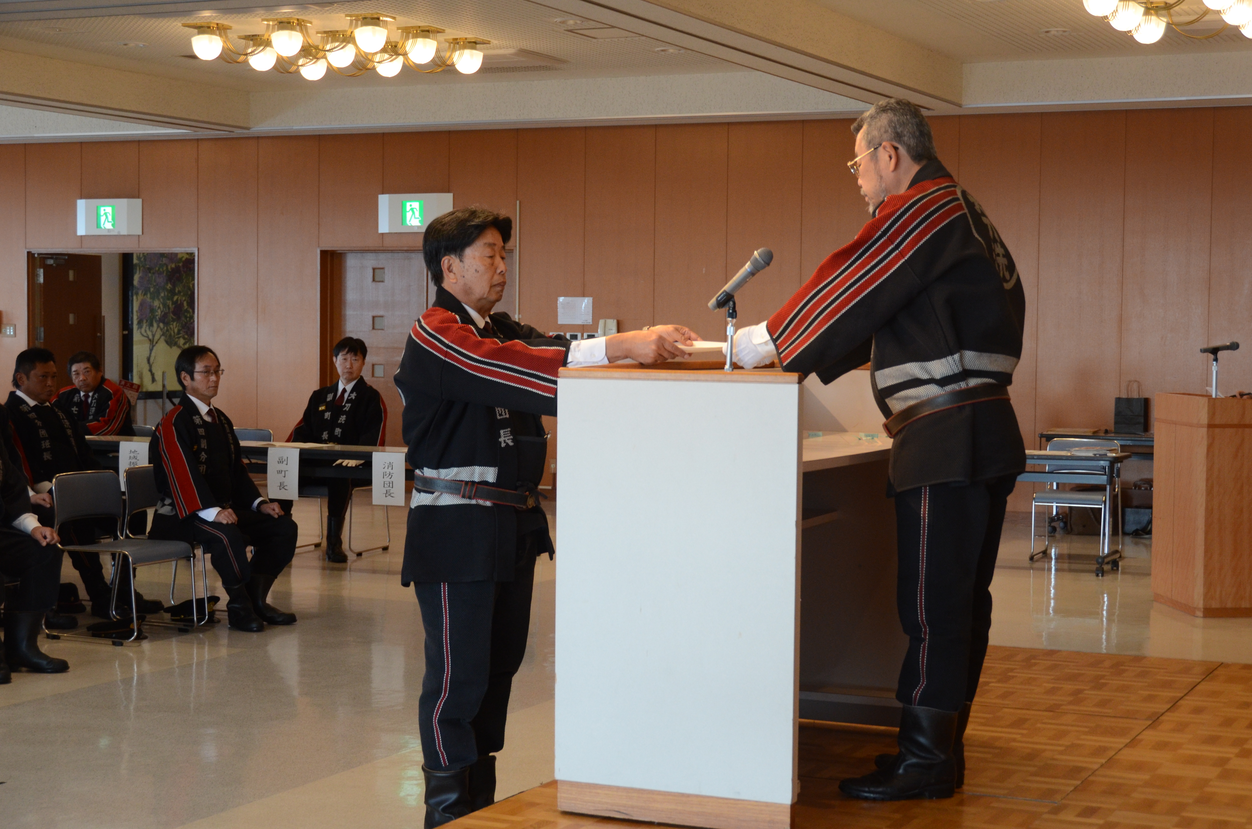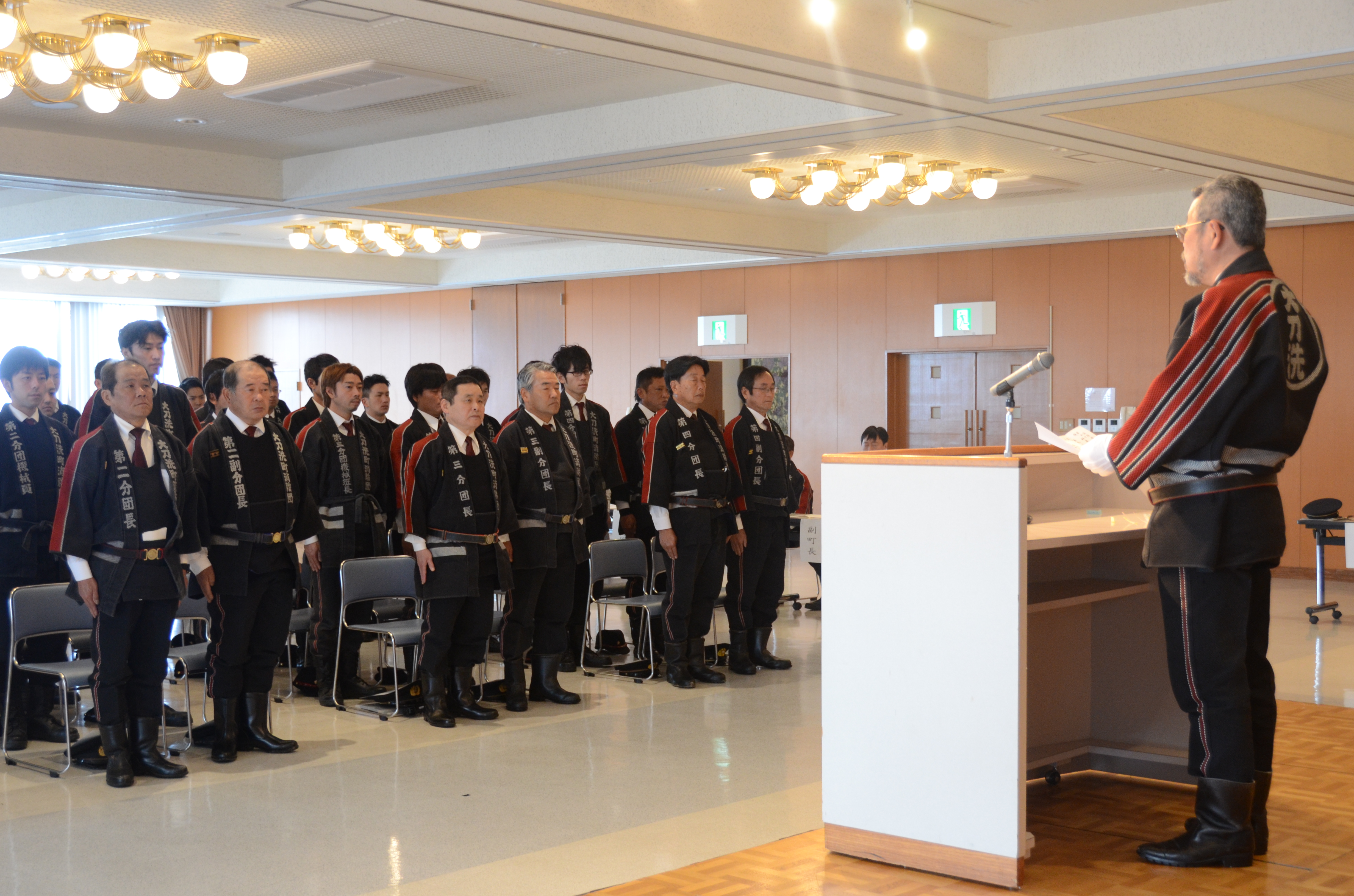 式では、退団幹部への感謝状贈呈、新たに任命される分団長等幹部への辞令交付及び団長訓示等が行われます。