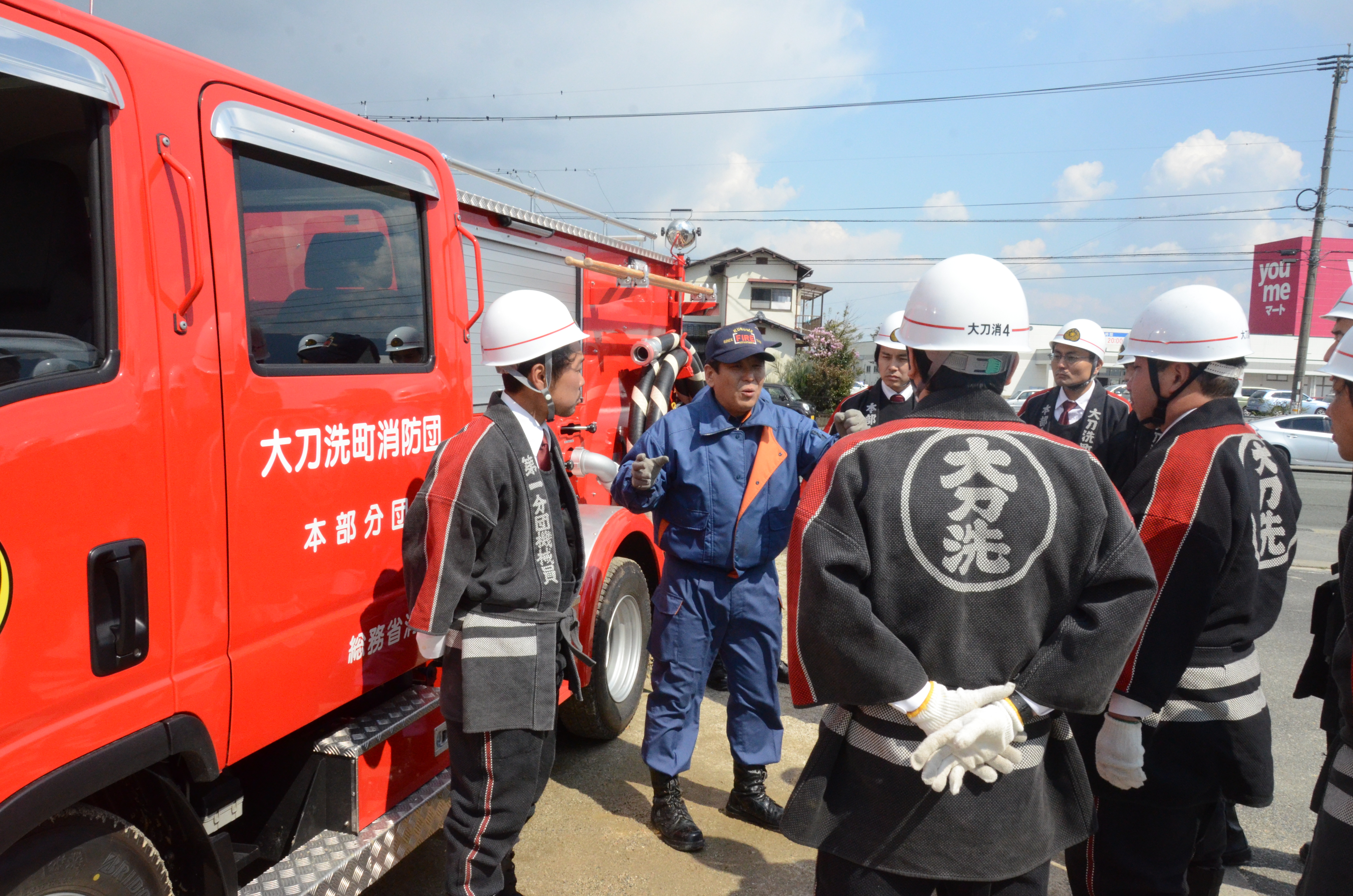 その後、屋外で、ポンプ車を使用した放水訓練等の教養訓練を実施します。