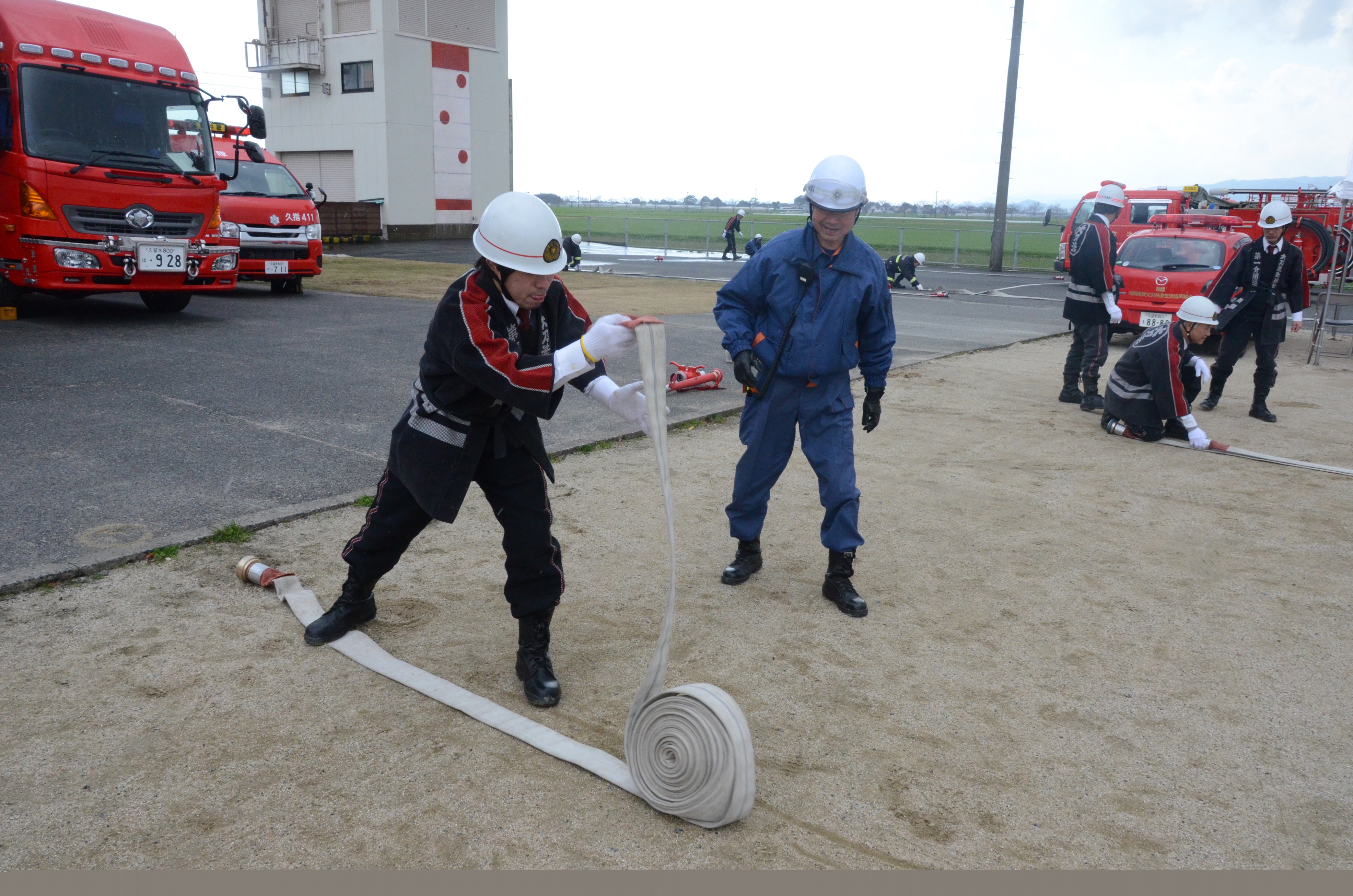 新入団員は、初めての消防訓練にとまどいながらも、三井消防署員の指導のもと、規律訓練や実践訓練として消防ホースの延長や収納を行なっています。特に放水訓練では、水しぶきに濡れながらも、しっかりと筒先を持って目標物をめがけて放水しています。