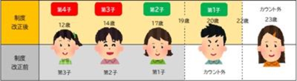 23歳・19歳・15歳 → 15歳の子どもは第2子となり、月額10,000円。23歳の子どもはカウントしません。
