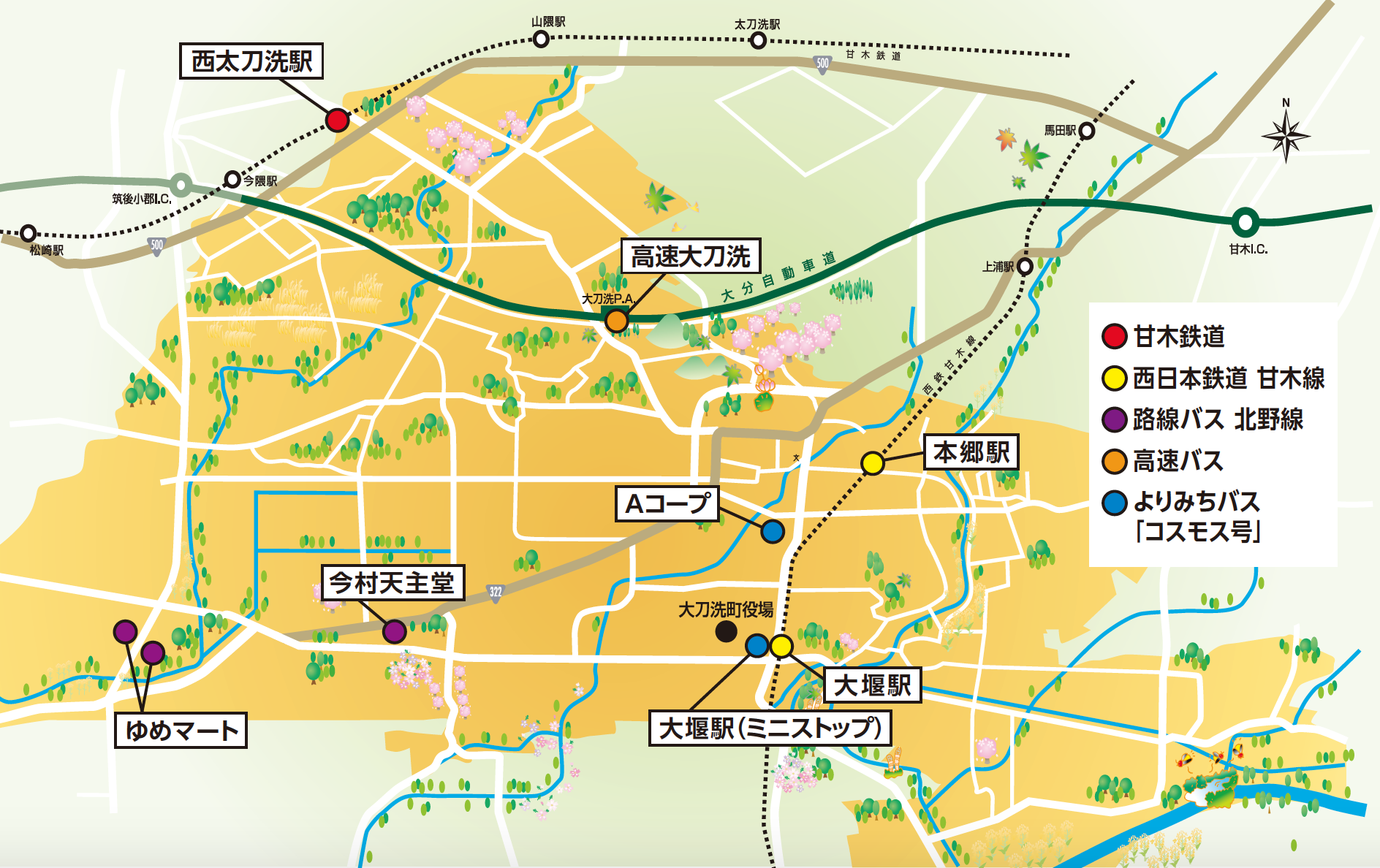 大刀洗町の公共交通機関 最終更新日:2020年2月19日 (ID:189) 印刷 大刀洗町の公共交通機関 町内には、鉄道やバスなど移動を支援するためのさまざまな公共交通機関があります。 町では、鉄道駅やバス停周辺に公共交通利用者を対象とした駐車場を整備するなど、公共交通の利便性向上や利用促進のための取り組みを進めています。 みんなで公共交通機関を積極的に利用しましょう。 大刀洗町公共交通マップ(大刀洗校区巡回バスを除く) 甘木鉄道 運行区間 甘木駅 ~ 基山駅 町内の駅・バス停 西太刀洗駅 ※駐車場あり 乗り換え・乗り継ぎ 甘木駅 ⇔ 西鉄甘木線 甘木駅/基山駅 ⇔ JR 基山駅 関連HP(時刻表)等 甘木鉄道 http://www.amatetsu.jp/time/index.html (外部リンク) 西日本鉄道 甘木線 運行区間 甘木駅 ~ 宮の陣駅 町内の駅・バス停 大堰駅 ※駐車場あり(別ウインドウ)/本郷駅 乗り換え・乗り継ぎ 甘木駅 ⇔ 甘木鉄道 甘木駅/宮の陣駅 ⇔ 西鉄大牟田線 関連HP(時刻表)等 西鉄くらしネット http://jik.nishitetsu.jp/ (外部リンク) 路線バス 北野線 運行区間 今村天主堂バス停 ~ 西鉄久留米バス停(Tジョイ・ゆめタウンバス停経由あり) 町内の駅・バス停 今村天主堂バス停 ※駐車場あり(PDF:162.4キロバイト) /ゆめマートバス停 乗り換え・乗り継ぎ 北野バス停 ⇔ 西鉄甘木線 北野駅/西鉄久留米バス停 ⇔ 西鉄大牟田線 久留米駅 関連HP(時刻表)等 西鉄くらしネット http://jik.nishitetsu.jp/ (外部リンク) 高速バス 運行区間 博多バスターミナル ~ 日田営業所(福岡空港バス停経由あり) 町内の駅・バス停 高速大刀洗バス停※駐車場あり 乗り換え・乗り継ぎ - 関連HP(時刻表)等 西鉄くらしネット http://www.nishitetsu.jp/bus/highwaybus/rosen/hita.html (外部リンク) よりみちバス 運行区間 主に久留米市北野町を運行しているバスの一部が町内に乗り入れています。 詳細は、関連HP(時刻表)等でご確認ください。 町内の駅・バス停 Aコープ/大堰駅(ミニストップ) 乗り換え・乗り継ぎ - 関連HP(時刻表)等 久留米市役所「よりみちバス」 https://www.city.kurume.fukuoka.jp/1080shisei/2050machi/3035koutsu/yorimichibus_201603.html (外部リンク) 大刀洗校区巡回バス 運行区間 主に大刀洗校区内の買い物や病院施設等を巡回するバスです。 詳細は、関連HP(時刻表)等でご確認ください。 町内の駅・バス停 詳細は、関連HP(時刻表)等でご確認ください。 乗り換え・乗り継ぎ - 関連HP(時刻表)等 時刻表(PDF:96キロバイト) 第1便、第2便(PDF:168キロバイト) 第3便(PDF:168キロバイト) 【参 考】 久留米広域連携中枢都市圏(久留米市/大川市/小郡市/うきは市/大刀洗町/大木町) 久留米市役所「公共交通マップ」 https://www.city.kurume.fukuoka.jp/1080shisei/2050machi/3035koutsu/2013-0416-1307-575.html (外部リンク) ※年1回の発行のため、掲載内容が最新の情報ではない場合があります。