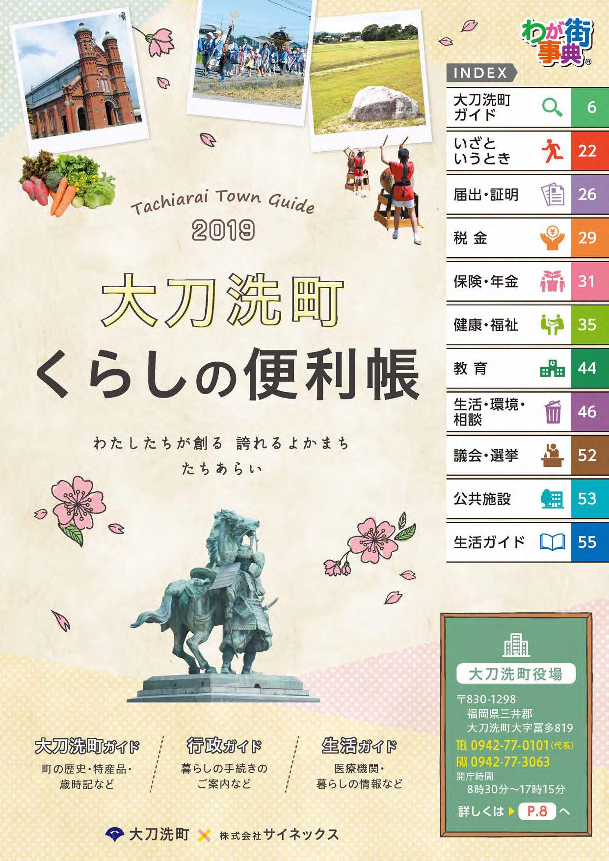 大刀洗町くらしの便利帳を作成しました 最終更新日:2020年1月16日 (ID:50) 印刷 2019 大刀洗町くらしの便利帳を作成しました 大刀洗町では、このたび「大刀洗町くらしの便利帳」を作成しました。この冊子は、地域の各団体及び事業者の皆様のご協力により発行・配布しています。 『この手続きは、役場のどこに尋ねたらいいの?』 などの行政手続きに関する内容に加えて、大刀洗町の概要やイベント、特産品なども掲載しています。 冊子は、町内の各家庭に無料で配布しています。地域振興課窓口でもお渡ししていますので、お気軽にお声がけください。 また、転入の際にも住民課窓口にてお配りしています。 「大刀洗町くらしの便利帳」は、本ホームページ内 刊行物 のコーナーからもご覧いただけます。 https://www.town.tachiarai.fukuoka.jp/publication/ ※大刀洗町くらしの便利帳は、お手持ちのスマホやタブレットにて電子書籍でもご覧いただけます。ご希望の方は、次のURLへアクセスし、ダウンロードしてください。 http://www.scinex.co.jp/wagamachi/loco/40503/dl_pc.html