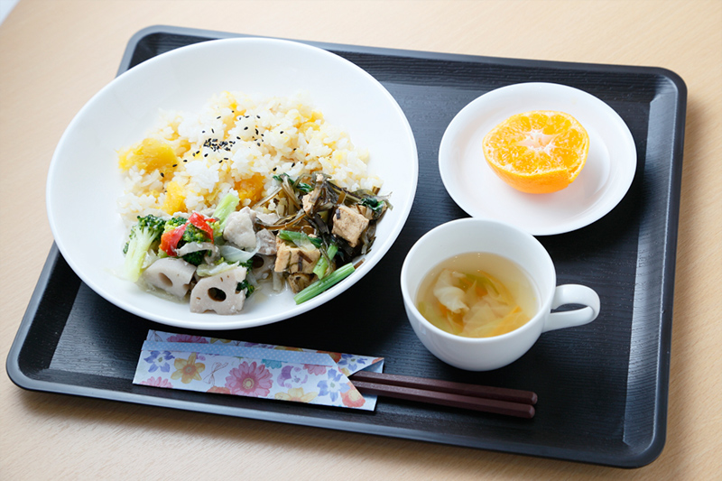 今日のランチは、鶏肉と彩り野菜の塩麹炒めと安納芋ご飯。