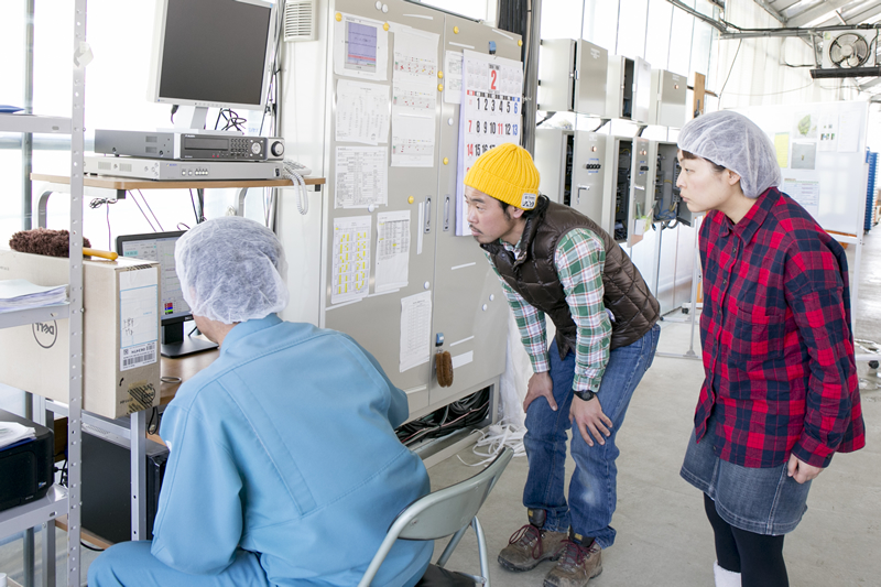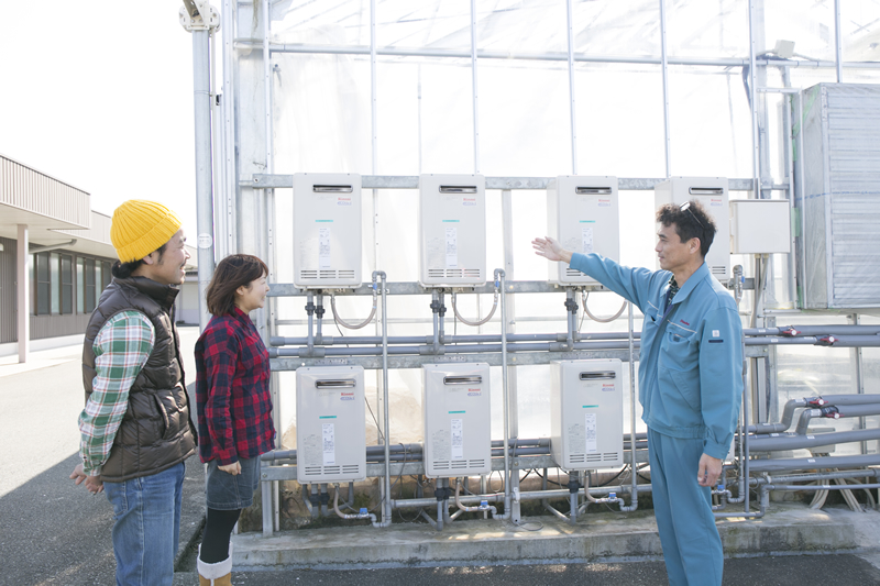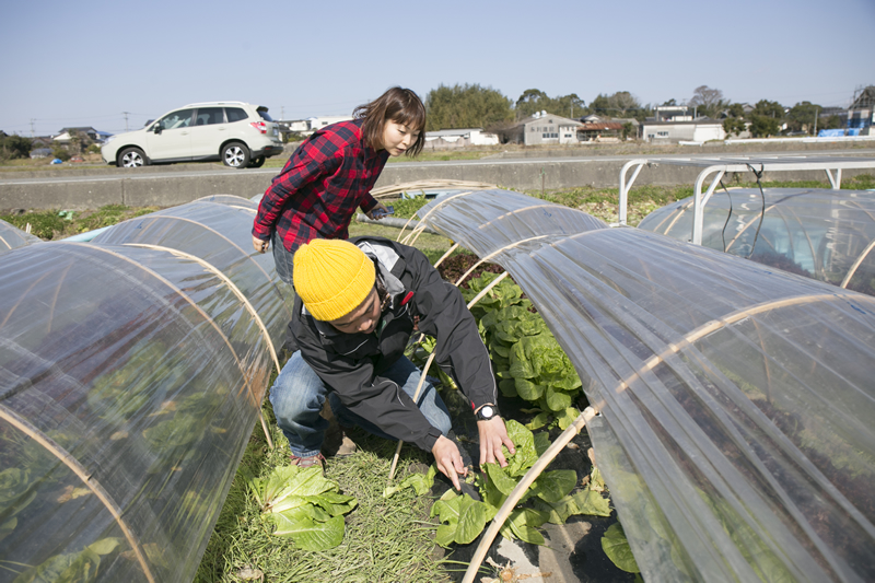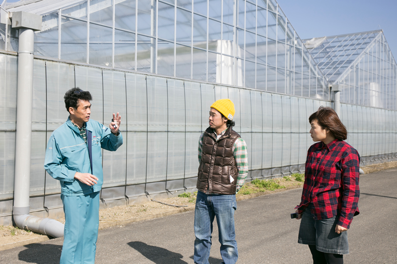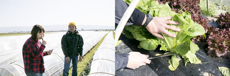 中垣晃博さんと歩く「前略、畑の上から」大刀洗の食と野菜と健康のこと 編 【前編】 最終更新日:2025年3月3日 (ID:880) 印刷 見渡す限り広がる平野に芽吹く葉物野菜達は、大刀洗を代表する風景の一つ。 青々と実る葉物野菜に夢をのせて、大刀洗の未来を考える若き農業家が活躍しているのをご存知でしょうか? 今回のナビゲーターは、大刀洗で野菜農園「アチコ'sファーム」を営む中垣晃博さん。 食べる事が大好きなライター・大内をお供に、中垣さんの野菜を使った人気レストランや最近気になっているITテクノロジーを駆使した農業工場に潜入。 大刀洗の青空の下、様々な角度から「食と野菜と健康」について考えます。 案内する人中垣 晃博さん大刀洗出身。アパレルショップのスタッフから農家に転身。現在では、野菜ソムリエの資格を持ち、サニーレタスやグリーンリーフなどを中心に年間で約50種を栽培。周辺の市場や飲食店へ卸すとともに、毎月第3日曜には「野菜屋アチコ」で直接販売している。プライベートでは3児のパパとしても奮闘中!案内される人ライター 大内食べる事が大好きで、普段はガッツリ肉食女子。野菜不足の生活をどうにかしたいと思ってはいるが、中々実行に移せずじまい。今日は野菜について学びたいと鼻息荒く参加。 アチコ'sファーム大刀洗にある中垣さんの農園「アチコ'sファーム」へ。鮮やかなグリーンのレタスや紫キャベツ、大根など、みずみずしい野菜たちは見ているだけで鮮度の良さが伝わります。腰丈くらいのビニールドームの間から爽やかに登場した中垣さん。大内おはようございます! 農作業中なのに、とってもおしゃれですね!中垣さん宜しくお願いします。 ありがとうございます。大内アパレルから農業家に! 思い切りましたね〜。 どんなきっかけで農業に?中垣さんもともと大刀洗の実家が米を作っていて、食に興味があったのですが、子どもが生まれてから、きちんとしたものを食べさせたいと思って農業を始めました。小郡市の農家へ研修に行って、ハウス栽培を学んで。 「アチコ'sファーム」を開いたのは2014年6月です。大内なるほど! その思いは今の野菜作りにも生かされているんですか?中垣さんそうですね。大量生産するのではなく、なるべく農薬を使わず、手をかけて育てた良質な野菜を目指しています。 買ってもらった人が満足してくれるような。大内ルッコラとか、紫白菜とか、市場では見かけない珍しい野菜も多いですね。中垣さん洋野菜などはレストランへ卸していて、おもしろい品種をというリクエストもあるんです。 これなんてキャベツですよ。大内丸くないんですね! 葉も黒っぽくて厚い。 味も青味が濃くて。中垣さん煮ると濃厚な味が生かされておいしいですよ。大内確かに! 食べごたえがありそう。 中垣さんの野菜は、どこで買えるのですか?中垣さん筑前町の直売所や大野城のイオン、遠くはマリナタウンで扱っています。 あとは毎月第3日曜に「野菜屋アチコ」としてセブンイレブン小郡三国が丘店で直接販売をしています。大内直接販売もされているんですね!中垣さん直接お客さんの顔を見ることができて、やりがいがありますね。 リピーターになってくださると嬉しいです。大内直売所などで「生産者の顔が見える野菜」として、野菜と一緒に作り手の情報が載せられていますが、野菜を作る側にとっても食べてくれる人の顔が見えるって大事なんですね。 実際に中垣さんの野菜を使ったメニューを出しているという大刀洗のレストラン「キッチン ヴェロン」さんへ。 その前に、中垣さんが前から気になっていた場所があるそうなので、行ってみました。中垣さん工業計器を製造、販売している「神港テクノス」という会社で、水耕栽培のレタスを作っていると聞きました。大内工業計器の会社と農業?不思議な組み合わせですね。そんな訳で、大刀洗にある「神港テクノス」さんへ突撃。 応対いただいた上野さんにハウスを案内してもらいました。中垣さん大内こんにちは! 今日はよろしくお願いします。 早速ですが、こちらはどんな会社さんですか?上野さんようこそ! 私たち「神港テクノス」は、もともと工業用計器の製造が本業で、温度や湿度を計測、調節する機器を様々なクライアントに合わせて設計・販売しています。大内あのう、レタスを栽培していらっしゃるとお聞きしたのですが、どんな理由で始められたのですか?上野さん当社のシステムを使って、何か地域貢献をできないかと考えたのが始まりです。 そこで、まずは自分たちでやってみようと、ハウスを建てて、内部でレタスを栽培してデータを取っています。 まずは、ハウスの中へどうぞ。ハウスの入り口では消毒後、帽子とエプロンを付けて中へ。 まるで食品工場のような厳しい衛生管理が徹底されています。明るくて温かいハウス内には、腰くらいの高さの栽培ベッドが8本あり、それぞれに水が満たされ、発砲スチロールの苗床が浮かんでいます。 土を使わ