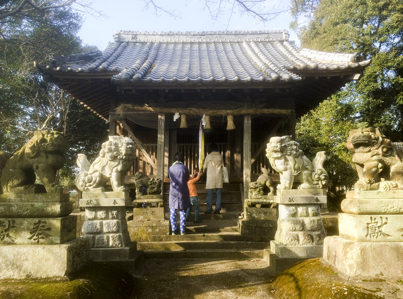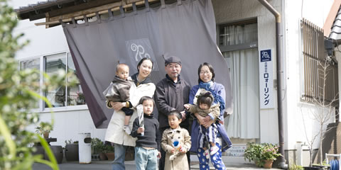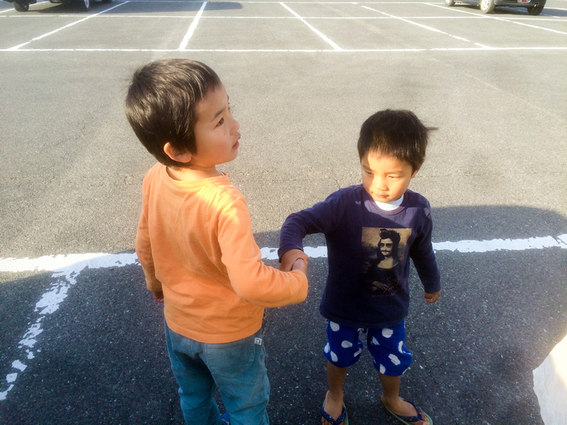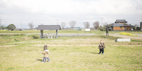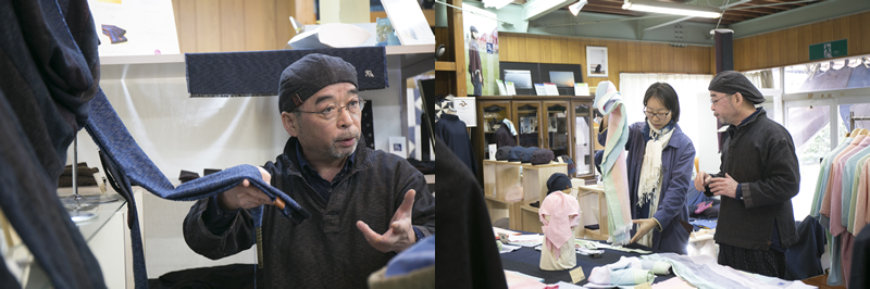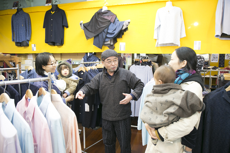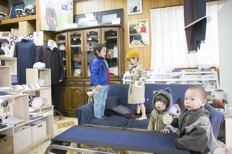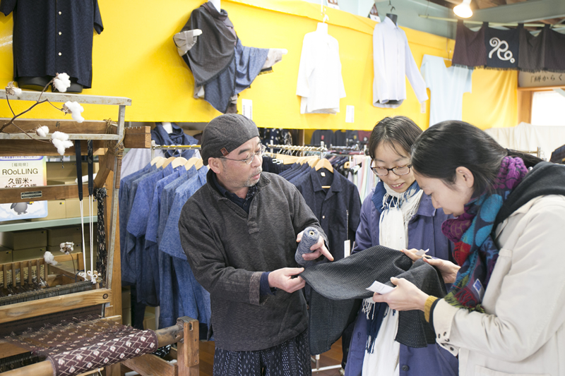 子どもと一緒にどこ行こう?大刀洗の景色に眠るものがたりを探して 編 【後編】 最終更新日:2025年3月3日 (ID:883) 印刷 二人のお子さんを持つ柳さんが、堀尾さん親子と共に、大刀洗の風景に合う「ものがたり」を探します。 まずは、大刀洗の子育て支援施設を回って、ママさんを取り巻く環境を紹介。 その後は、広々とした公園で絵本の読み聞かせだったのですが、予定変更! 菜の花咲く原っぱで野遊びを楽しみました。 さて、後半は柳さんが気になっていた久留米絣のお店に潜入! どんな「ものがたり」が待ち構えているのでしょうか?案内する人柳真子さん &しゅんたろうくん & そうしろうくん小学校から大刀洗で育ち、現在は4歳のしゅんたろうくんと1歳のそうしろうくんのママとして子育中。プライベートでも絵本や詩の読み聞かせイベントを企画するなど、アクティブに活躍している。趣味は久留米絣の服作りで、取材当日も親子3人とも真子さんお手製の絣のズボンでおしゃれにコーディネート。案内される人堀尾真理さん & まれくん & ゆうくん5歳になったばかりのまれくんと1歳のゆうくん兄弟のママであり、ライター、編集者、バレエ講師と、多彩な肩書きを持つ。福岡市内在住。子どもと大刀洗町で過ごすのは今回が初めて。柳さん家のしゅんたろうくんとそうしろうくんとは、年齢も構成も同じで、初対面にも関わらず、かなりの仲良しっぷりを発揮。 お次は、久留米絣の洋服作りが趣味という柳さんがずっと訪れたかった工房へ。久留米絣の伝統技術を元に開発したオリジナル素材の「からくり®織」シリーズを素材に、スタイリッシュで機能的に進化させた商品ブランド「ロォーリング®」を展開しています。オーナーの實藤さんにお話をお聞きしました。次から次に飛び出すアイディアと、3分に一度は笑いが起きるユニークな語り口はこの日も絶好調!實藤さんいらっしゃい! よう来たね! あら、子どもさん同士仲良いね〜。今日会ったばっかりなのに、子どもたちはもう仲良し。 キッズ達がお絵描きに夢中なうちに、實藤さんにご挨拶。 普段から久留米絣の服を作っているという柳さんはお聞きしたい事があったそうで。柳さん私、子ども向けの甚平を作りたいのですが、ハギレや布って売ってもらえるんですか?實藤さんもちろん! 原色がいいちゃっない。 この生地はもともと甚平用なんだよ。柳さん・堀尾さんかわいい!! こんな色もあるんですね!ビビッドな黄色や青の木綿地は新鮮なイメージ。 襟の裏地にさりげなく使っている久留米絣のシャツもおしゃれ。 久留米絣の藍色を引き立ててくれます。堀尾さん久留米絣っていうくらいだから、久留米で作られていると思っていました。實藤さん久留米絣に使った藍染の原料の多くは、大刀洗の三川地区で栽培されて、染料の「すくも」に加工されていたのよ。 だから、大刀洗でも久留米絣が盛ん織られていたというわけ。ほら、このハギレを触ってみて。 100年くらい前にうちのばあちゃんが織った布なんだけど、丈夫で全然切れないでしょう。堀尾さん本当だ! 薄いのに丈夫。 手触りもなめらかで気持ちいい!柳さん手仕事って感じでいいね!實藤さんやろ〜。 普通の絣は、経(たて)か緯(よこ)糸のどちらかで織るだけやけん、白と藍色の2色なんだけど、 久留米絣は経と緯を組み合わせて織るとよ。 だけん、白、藍色、中間色で表現できる。 そうすると鮮やかな柄になって、デザインの幅も広がるよね。 難しいし、手間もかなりかかるけどね。柳さんそれで丈夫なんですね。 この黒い色も素敵!實藤さんそれ、本当は藍色なんよ。 何回も染めると、どんどん色が黒に近づく。 しかも生地も丈夫になっていくとよ。 キレだけに切れないってね。堀尾さんちょこちょこギャグが入ってる(笑)實藤さんついつい入れてしまうとよ(笑)實藤さんそして、この技術をさらに工夫したのが、オリジナルのブランド『からくり®織』。 これはね、色の違う2本の糸を合わせて一本にして、その糸を使って編む。 ほら、それぞれの糸の色が交互に出て、点線みたいになるやろ。柳さん風合いがかわいいですね。 ちょっとグラデーションっぽくて優しい雰囲気。實藤さん久留米絣をもっと気軽に楽しんで欲しいと思って、3年かけて開発したとよ。 糸をしっかりとよらずに添わせるくらいにすると、空気を含んで温かくふんわりとした感触になる。 このKARAKURI (3)の生地は、蛍光物質なんかは使っていないから、子どもたちが舐めたとしても大丈夫! 洗うほど、いい風合いになるからね。 僕が被っているこのハンチングなんて、毎日洗濯機で洗って2年経つけど、新品よりずっと気持ちいいでしょう。柳さん逆にビンテージ感がある風合いになっている。 全然傷んでいませんね。堀尾さん肌に当たる部分がとても柔らかくて、フィット感もいい。實藤さん2年経ったこの状態のハンチングを売ってとも言われるよ(笑)工房の中は、絣を使った洋服や小物などがズラリ。 中には、珍しいデザイ