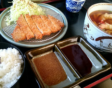 サクサクの揚げたてカツは、2種類のソース(普通のとんかつソースと、玉ねぎベースのさっぱりソース)をつけて食べると、最高にご飯が進みます。ご飯も、これでもか、のてんこ盛りで、ガッツリ食べたい方にもいいと思います。